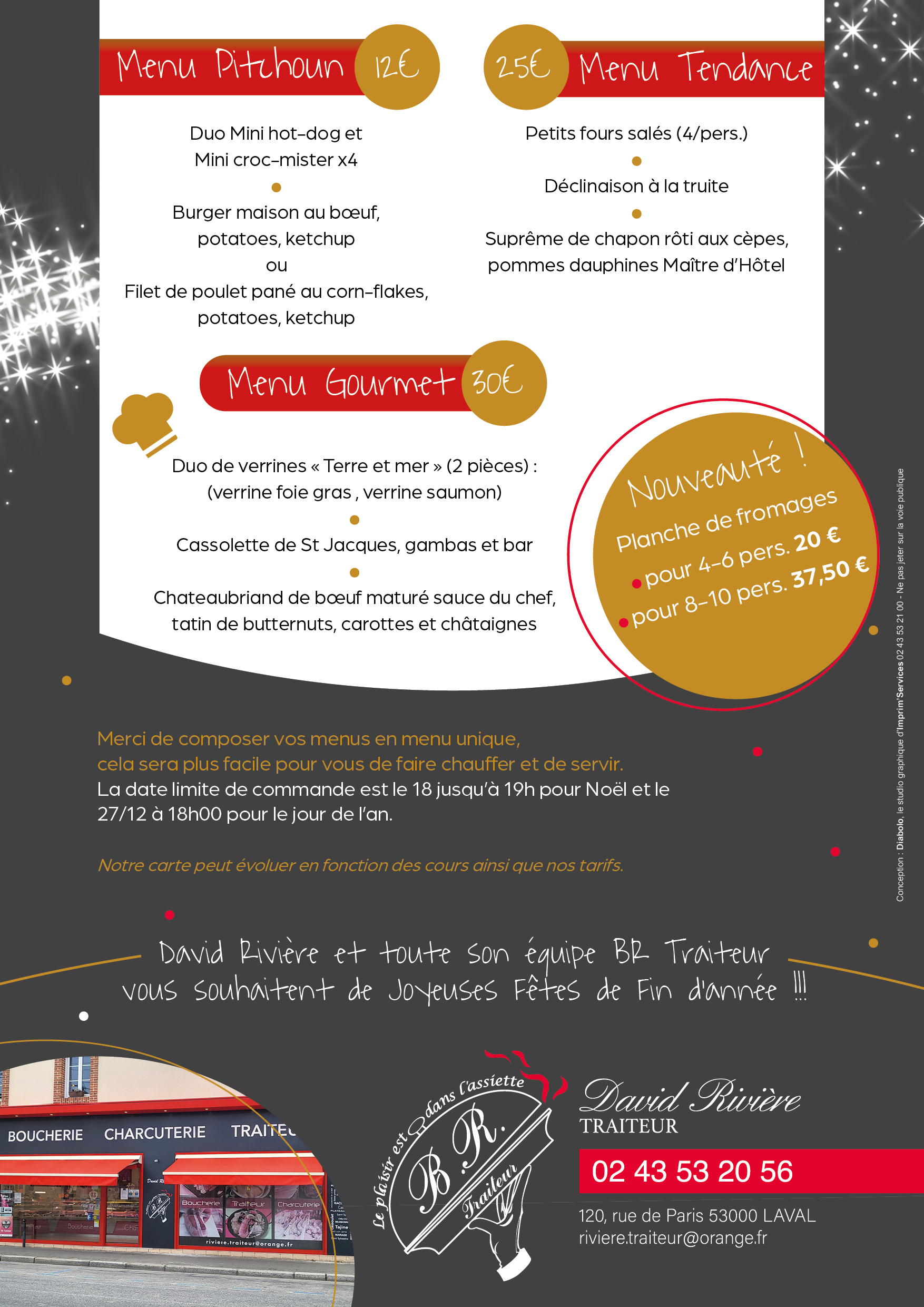 Carte des Fêtes BR Traiteur Contact 02 43 53 20 56 120 rue de Paris53000 Laval Horaires Lundi : FerméMardi, Jeudi, Vendredi, Samedi : 8h30-13h / 15h30-19h30Mercredi : 8h30-13hDimanche : Fermé